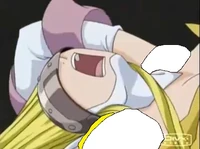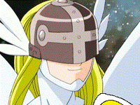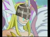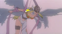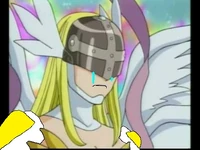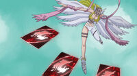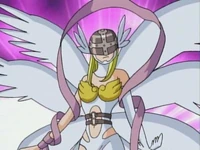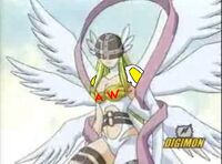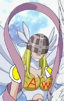 Angewomon wears a Holy Ring on her left ankle, and the DigiCode on her ribbons reads (デジタルモンスター Dejitaru Monsutā, lit. "Digital Monster")