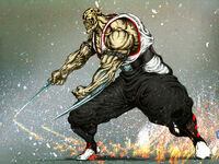 Baraka was introduced as a mean, unforgiving, and unpredictable warrior in service of The Emperor Of Outworld, (Shao Kahn) in Mortal Kombat II. He belongs to a race of nomadic mutants, later revealed in Mortal Kombat: Deception to be called Tarkata, a crossbreed between vile Netherrealm demons and denizens of Outworld, apparently populating the vast wastelands of Outworld. Like most members of his race, Baraka possesses long blades extending from his forearms. Although he has had numerous incursions with the Earthrealm warriors, he does not appear to have any particular rivalry or hatred towards Earth or its inhabitants. As a loyal warrior, he fights for those whom he calls "master".