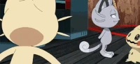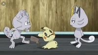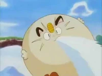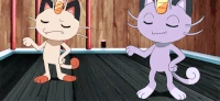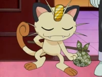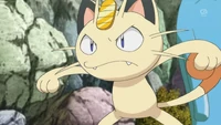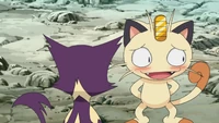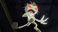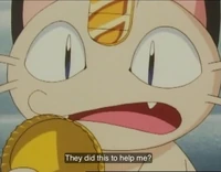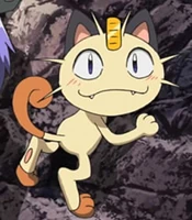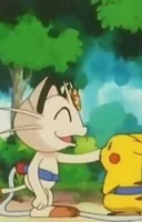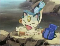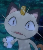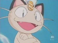 There were 2 Meowths featured here, one was Team Rocket's Meowth while the other was a good clone of him. They were first introduced in The Viridian Center Peril, as they first met each other; unlike the evil twin, the good Meowth wore a police hat as a part of a police crew alongside Jessabelle and Jim. The good Pokémon was affected and lost to the looming Darkness, and his bad side got the upper hand, until Ash's Pikachu saved the center while destroying the place with them. It was also revealed that the good Meowth contained one of the ten Pokémon Stones that Ly left behind as indicated by Ribbon's Crystal.