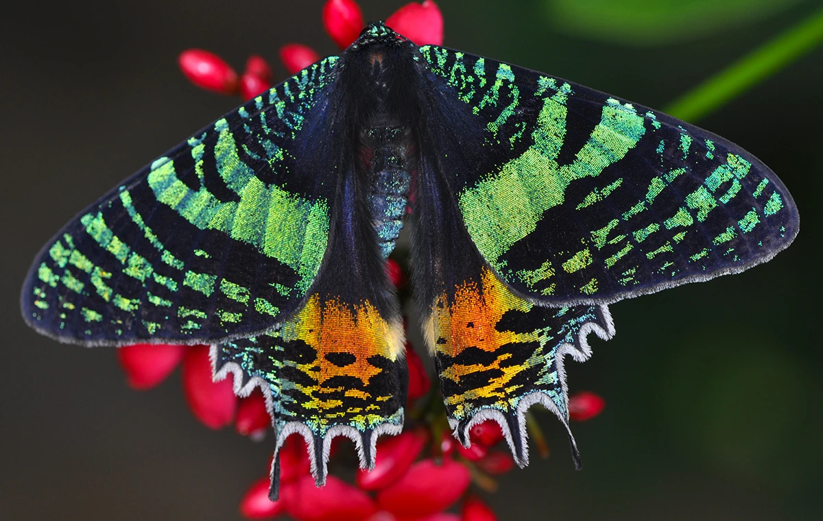 Chrysiridia rhipheus, the Madagascan sunset moth, is a day-flying moth of the family Uraniidae. It is considered one of the most impressive and appealing-looking lepidopterans. Famous worldwide, it is featured in most coffee table books on Lepidoptera and is much sought after by collectors, though many older sources misspell the species name as "ripheus". It is very colourful, though the iridescent parts of the wings do not have pigment; rather the colours originate from optical interference. Adults have a wingspan of 7–9 cm (2.8–3.5 in).